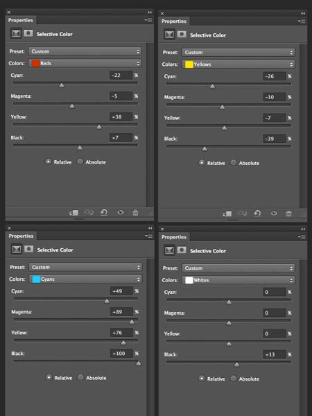 Создайте новый корректирующий слой Выборочная коррекция цвета (Selective Color) поверх всех слоёв. Для корректирующего слоя Выборочная коррекция цвета (Selective Color), примените значения, которые указаны на скриншоте ниже.