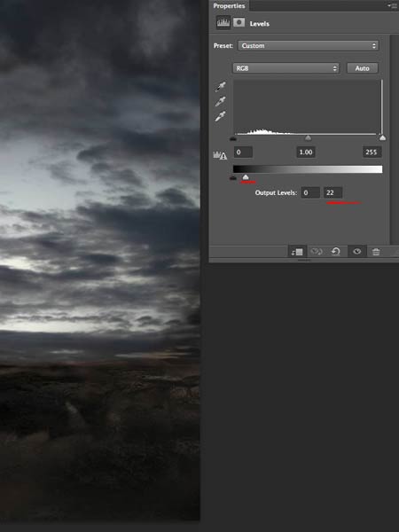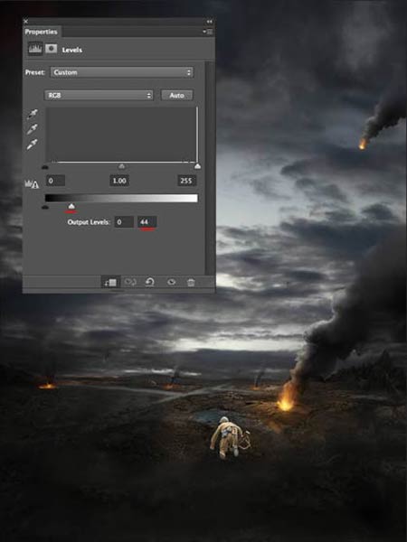 То же самое, что мы проделывали в предыдущих шагах, создайте новый корректирующий слой Уровни (Levels), преобразуйте данный корректирующий слой также в обтравочную маску к слою с землёй. Примените настройки, которые указаны на скриншоте ниже.