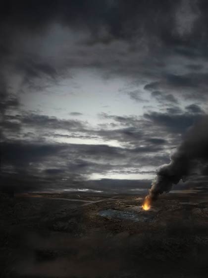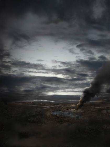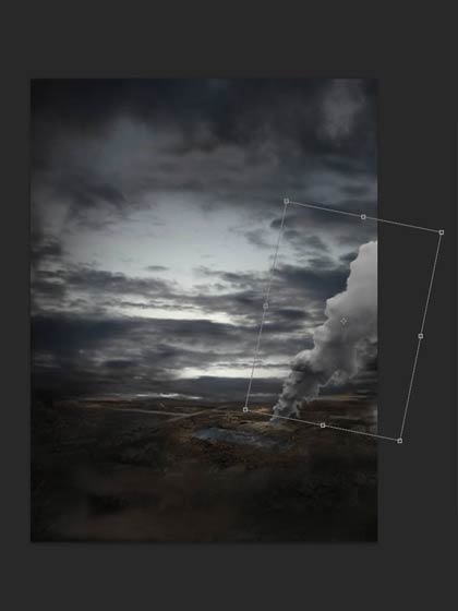 Итак, мы закончили работу над созданием земли и неба, давайте перейдём к следующему шагу. Откройте изображение с дымом, переместите данное изображение на наш рабочий документ, расположив, как показано на скриншоте ниже. Создайте новую группу для слоя с дымом Ctrl + G, назовите эту группу “Дым и Огонь”.