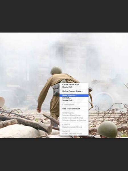 (Pen Tool (P) и далее, с помощью данного инструмента создайте выделение вокруг изображения солдата. Как только вы замкнёте контур, щёлкните правой кнопкой по контуру и в появившемся окне. вы берите опцию Образовать выделенную область (Make Selection), а затем нажмите клавиши Ctrl + J, чтобы скопировать выделенное изображение солдата на новый слой.