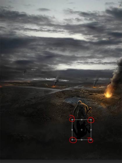 Мы используем данную часть изображения в нашей композиции для создания размытых / витающих в воздухе искр от огня. Переместите выделенную часть изображения с икрами огня на наш рабочий документ, а затем нажмите клавиши Ctrl + T для активации инструмента свободная трансформация, расположите изображение, как показано на скриншоте ниже.