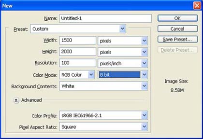 Создайте новый документ (Ctrl+N) 1500 px по ширине 2000 px по высоте и установите цвет заднего фона- белый, а значение резолюции 100 пиксейлей / дюйм.