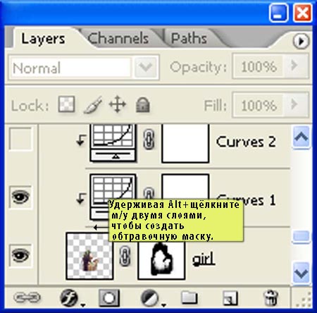 Удерживая клавишу Alt + щёлкните между двумя слоями (между корректирующим слоем Цветовой тон / Насыщенность (Hue/Saturation) и корректирующим слоем Кривые (Curves) для создания обтравочной маски).