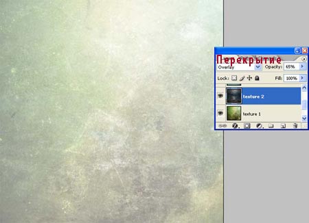 Поменяйте режим наложения для этого слоя на Перекрытие (Overlay) и уменьшите Непрозрачность (Opacity) слоя до 65%.