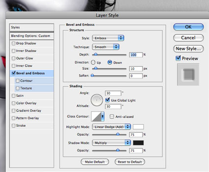 Примените к полученной чёрной фигуре стиль Тиснение (Bevel & Emboss):