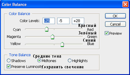 Когда появится окно корректирующего слоя Цветовой Баланс (Color balance), примените следующие значения:
