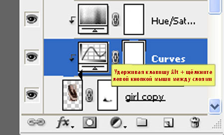Далее, создайте новый корректирующий слой Кривые (curves), данную коррекцию можно активировать через нижнюю панель инструментов. Удерживая клавишу Alt+ щёлкните левой кнопкой мыши между 2 слоями (корректирующим слоем Цветовой Тон / Насыщенность и корректирующим слоем Кривые), чтобы преобразовать корректирующий слой в обтравочную маску.