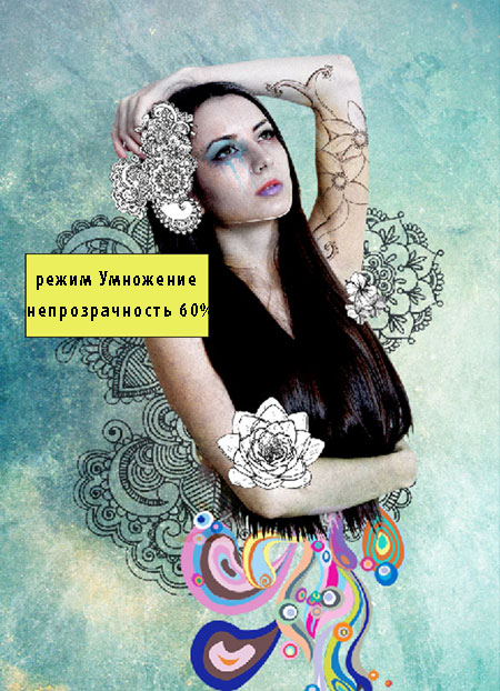 Далее, поменяйте режим наложения для слоя с узором цветов на Умножение (multiply) и уменьшите непрозрачность до 65%.