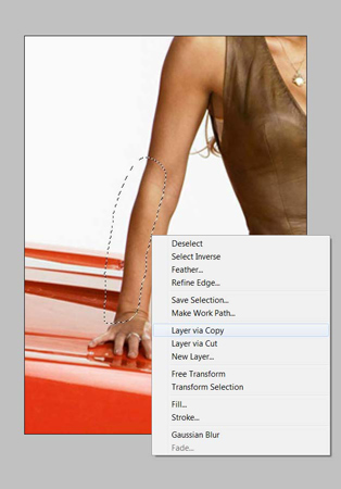Выделите продольную половину части тела, над которой вы хотите поработать, и выберите Layer via Copy (Скопировать на новый слой). В данном случае, это предплечье.