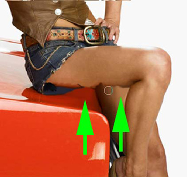 (Палец) , взяв за образец некоторые цвета машины и кожи с другого бедра. Я использовал цвета с шорт, чтобы примерно воссоздать обратную сторону ткани с помощью мягкой кисти со 100% Opacity (Непрозрачностью). Это должно обеспечить только основную форму, так что не старайтесь всё детально прорисовать.