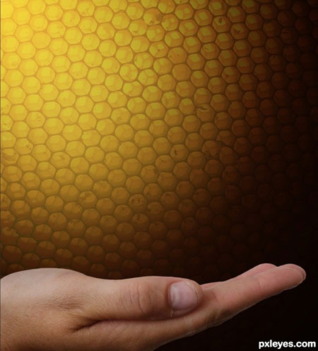 Второй слой. Вставьте в рабочий документ изображение сот и измените ему размер, если это необходимо. Установите режим наложения Яркий свет (Vivid Light) и непрозрачность (opacity) 25%. К слою с сотами добавьте маску (mask). Используйте на маске мягкую черную кисть (brush) среднего размера, чтоб скрыть нижнюю правую сторону (или для этого можно использовать градиент от белого к черному).
