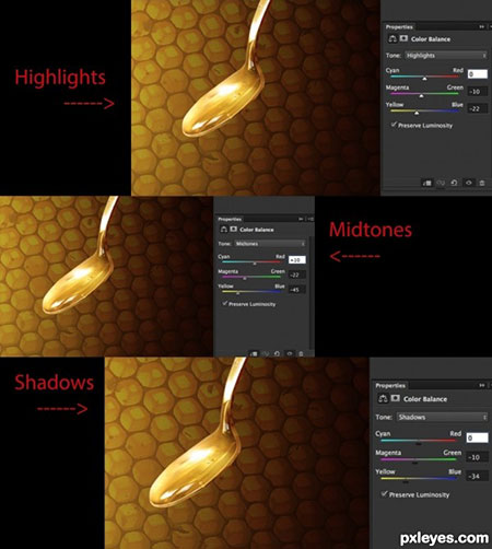 Создайте новый корректирующий слой Цветовой баланс (Color balance), разместите его над слоем с ложкой и добавьте обтравочную маску (clippig mask). Пришло время выбрать цвет для меда. Например, я захотел сделать его более желтым с оранжевым отливом.