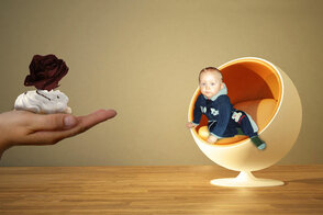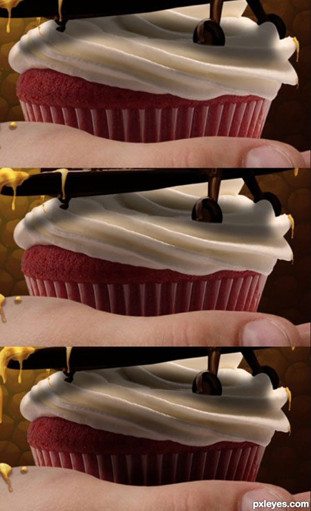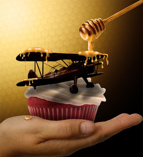 Когда вы загрузили изображение с пирожным и отделили его от фона, используйте ту же технику для придания контраста, что и с рукой: скопируйте слой, обесцветьте и т.д. Далее слейте эти два слоя, чтоб слой с пирожным был только один, и разместите его выше остальных слоев и попытайтесь вложить его в руку. Как показано на изображении, пирожное уже неплохо сидит в руке и светотень тоже в порядке. Я еще вернусь к этому, а пока пришло время поработать над шоколадным самолетиком.