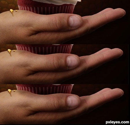 Делаем то же с рукой. Я добавил темно-желтую тень на ладонь, немного красной - под пирожным, темно-коричневую – под пальцами, чтоб они лучше смотрелись на фоне.