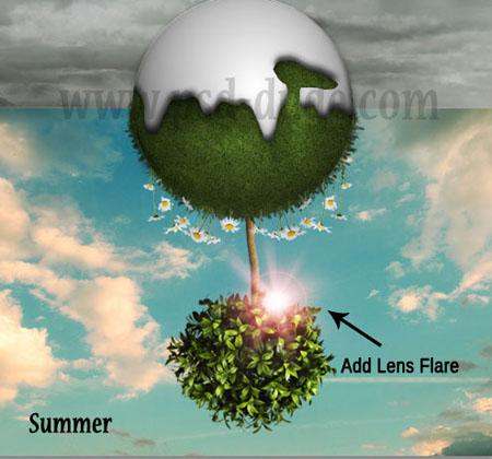 Теперь мы собираемся создать два сезона и начнём с летнего. Этот сезон у нас внизу поэтому все элементы для него необходимо будет Отразить по вертикали (Flip Vertical). И так, добавим сначала цветы ромашки. Уменьшите их и отразите по вертикали. С помощью инструмента Ластик