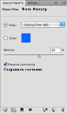 Оригинальное изображение выполнено немного в тёплых тонах, поэтому, мы используем корректирующий слой Фото Фильтр (Photo Filter). Установите фильтр Cooling filter (80), Плотность (Density) 60%.