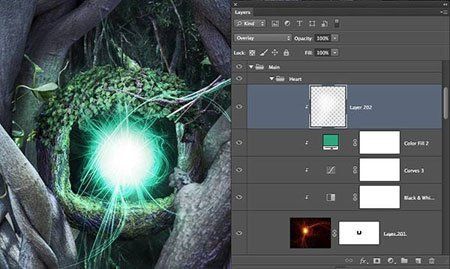 Далее, нам нужно добавить несколько корректирующих слоев. Черно-белый слой (настройки по умолчанию), слой Curves (Кривые), повышающий немного контраста и слой залитый цветом # 29a77f, режим наложения Overlay (Перекрытие). Если вы еще не сделали этого при создании слоев, то удерживая клавишу Alt, нажмите на линию между каждым слоем, чтобы применить их к слою Energy. Вы должны получить что-то вроде этого: