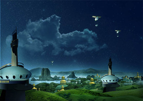 Чтобы добавить побольше динамики к сцене, я решил добавить несколько летательных аппаратов. На скриншоте ниже, летательный аппарат, который я создал. Техника создания летательного аппарата почти та же самая, что и для создания здания с куполом. Для этого я использовал стили слоя, а также применил раскраску созданных элементов.