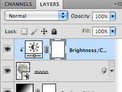 В заключение, примените корректирующий слой Яркость / Контрастность (Brightness/Contrast) к слою с Луной в качестве обтравочной маски. Как только вы создали корректирующий слой, щёлкните правой кнопкой мыши по слою с корректирующим слоем и в появившемся окне выберите опцию Создать обтравочную маску (Create clipping mask). С помощью обтравочной маски, эффект корректирующего слоя будет применён только к изображению Луны.