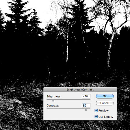 Уменьшите значение Яркости (Brightness) и увеличьте значение Контрастности (Contrast), таким образом, небо станет полностью белым, а деревья чёрными.