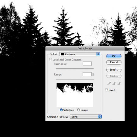 Далее, идём Выделение – Цветовой диапазон (Select>Color Range), в настройках установите опцию Тени (Shadows). Данная опция выделит контур деревьев, далее скопируйте / вклейте активное выделение на наш рабочий документ.