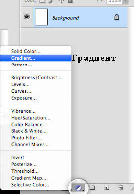 Как только вы создали новый документ, в нижней панели инструментов, нажмите на кнопку создания Корректирующих слоёв (Adjustment Layers) и в появившемся меню, выберите опцию Градиент (Gradient).