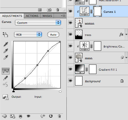 Далее, перейдите на слой с моделью. К слою с моделью, давайте, применим корректирующий слой Кривые (Curves) в качестве обтравочной маски. Установите 3 опорные точки на кривой, как показано на скриншоте ниже, чтобы слегка усилить контраст.