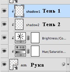 К слою с рукой, примените корректирующие слои Цветовой тон / Насыщенность (Hue/Saturation) и Яркость / Контрастность (Brightness/Contrast) в качестве обтравочных масок. Сместите бегунки так, чтобы изображение выделенной руки было, похоже по цвету и контрасту со второй рукой.