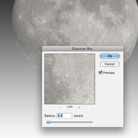 Далее, находясь на слое с изображением Луны, идём Фильтр – Размытие – размытие по Гауссу (Filter>Blur>Gaussian blur). Примените радиус размытия 0.8 px.