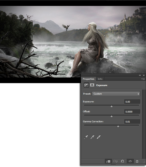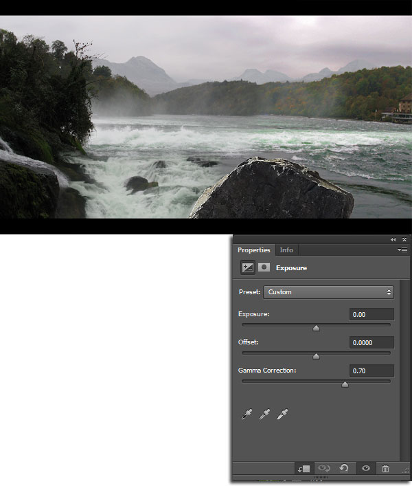 3) Далее, к слою с горной рекой добавьте корректирующий слой Экспозиция (Exposure), установите значение Гаммы Коррекции (Gamma Correction) на 0.70.