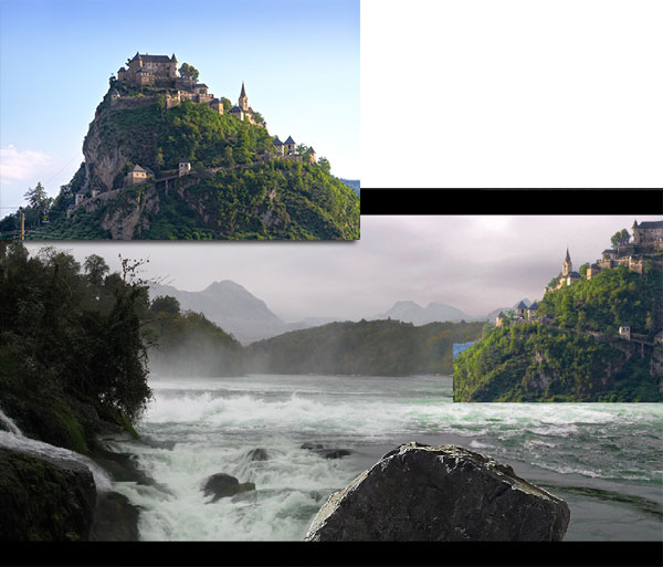 С помощью слой-маски, скройте жёсткие края на изображении замка, чтобы создать плавный переход и совместить со всей сценой.