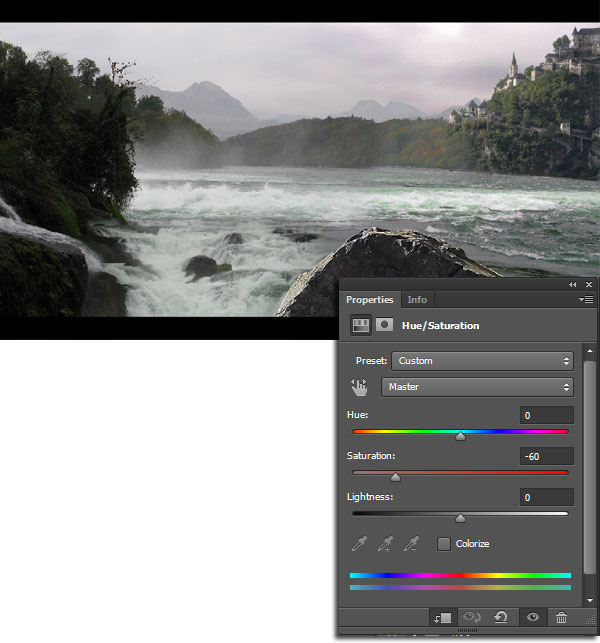 2) Далее, добавьте корректирующий слой Цветовой тон / Насыщенность (Hue/Saturation). В настройках уменьшите значение Насыщенности (Saturation) до -60.
