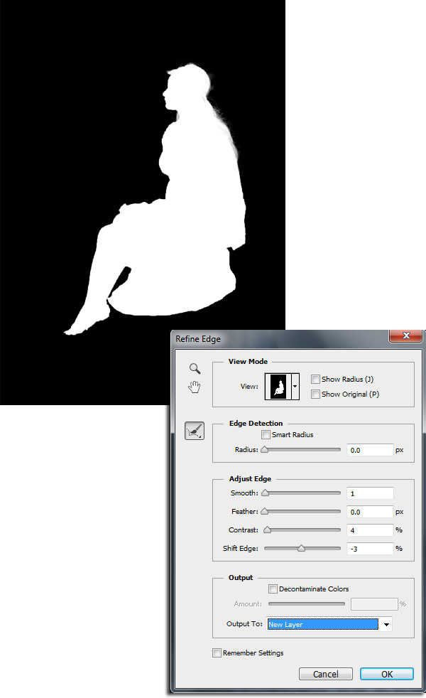 2) Далее, выберите опцию Уточнить край (Refine Edge), в настройках установите значение Сгладить (smooth) на 1, Контраст (Contrast0 на 4%, а Сместить край (Shift Edge) на -3%, а затем с помощью инструмента Уточнить радиус (Refine Radius tool), прокрасьте поверх краёв контура модели, чтобы создать идеальное выделение краёв изображения модели.