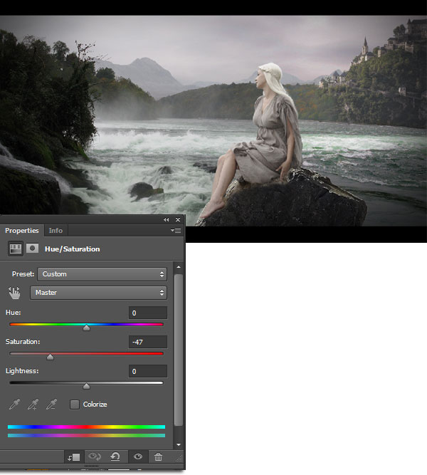 3) К слою с моделью добавьте корректирующий слой Цветовой тон / Насыщенность (Hue/Saturation). В настройках уменьшите значение Насыщенности (Saturation) до -47.