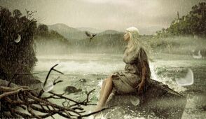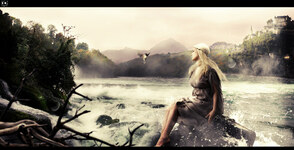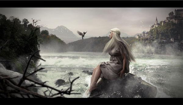 Примечание переводчика: вначале автор объединяет 2 слоя с рекой, а затем создаёт отдельный слой с ландшафтом и отдельный слой с небом, а затем между этими слоями, автор дополнительно добавляет изображение гор для усиления ландшафта.