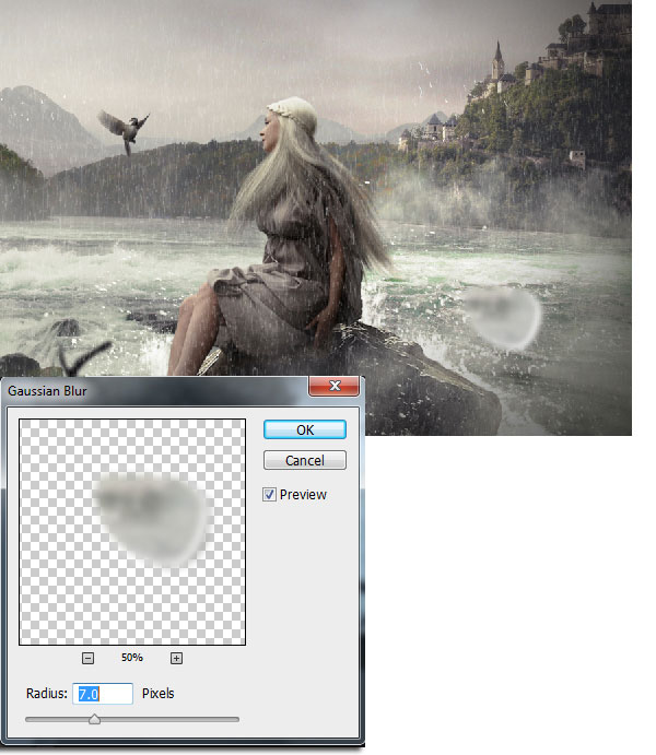 3) Теперь, объедините слой с каплей воды и слой с каплей воды с изображением реки в один слой. А затем к объединённому слою, добавьте фильтр Размытие по Гауссу (Gaussian Blur), радиус размытия 7.0px, чтобы получить желаемый эффект.