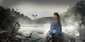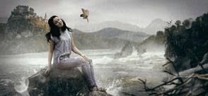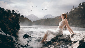 1) Откройте стоковое изображение с горной рекой, выделите часть изображение, а затем переместите выделенную часть изображения на наш рабочий документ, расположив слева от камня, как показано на скриншоте ниже. Далее, с помощью инструмента Ластик