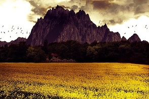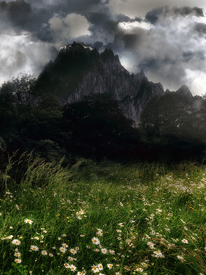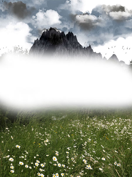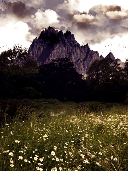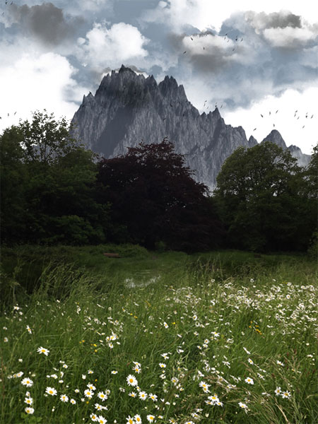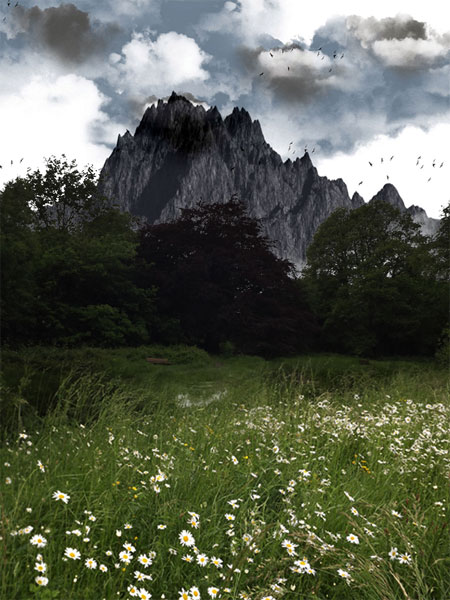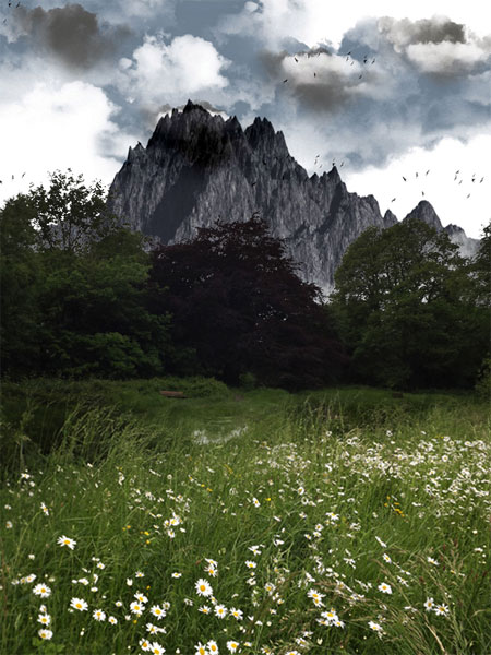 Примечание переводчика: кроме коррекции пейзажа, автор, скорее всего, забыл упомянуть про световую коррекцию гор, поэтому, к слою с горами, добавьте корректирующий слой Кривые в качестве обтравочной маски для совмещения изображения гор с остальными изображениями. Поэкспериментируйте с настройками корректирующего слоя.