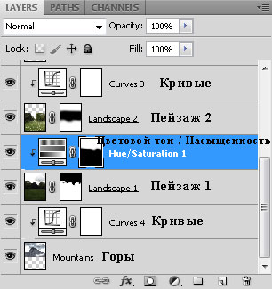 Примечание переводчика: Не забудьте преобразовать корректирующий слой Кривые в обтравочную маску к слою c ‘Пейзажем 2’.