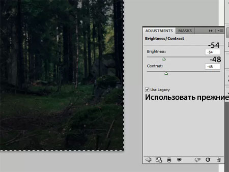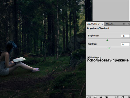 У нас тёмный лес, кругом ночь, поэтому, мы должны добавить тени на нашу модель. Добавьте новый корректирующий слой Яркость / Контрастность (brightness/contrast):