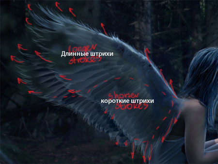 Далее, мы подготовим тень, которую будет создать ангел. С помощью мягкой чёрной кисти, размер кисти 65px, нарисуйте тени, где нарисована стрелка:
