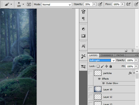 Создайте новый слой. Выберите мягкую круглую кисть, размер кисти 23 px, непрозрачность кисти 45%. Прокрасьте кистью по краям камней и деревьев. Поменяйте режим наложения для данного слоя на Осветление (screen). Уменьшите непрозрачность слоя до 65%: