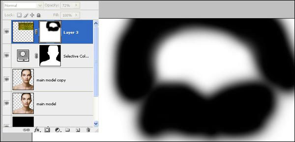 Далее нам нужно замаскировать текстуру с перьями так, чтобы она располагалась только в области лба модели. Нажмите на значок Add Layer Mask (Добавить слой-маску) в нижней части палитры слоев, выберите мягкую круглую кисть размером 200px, и пройдитесь ею по маске слоя, как показано ниже.