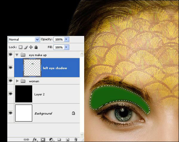 (Перо) выделите верхнее веко, как показано на скриншоте ниже, примените к выделению Feather (Растушевка) 4px. Теперь заполните выделение зеленым цветом # 3A601D, нажав Alt + Backspace. Поменяйте режим наложения слоя на Color (Цветность) с Opacity (Непрозрачность) 73%.