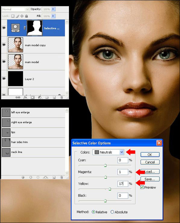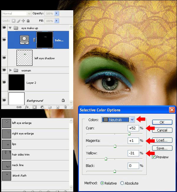 (Перо) выделите область подвижного века, применив Feather (Растушевка) 2px. Нанесите синий цвет с помощью корректирующего слоя Selective Сolor (Выборочная коррекция цвета) с настройками, показанными ниже. Теперь примените те же методы нанесения макияжа для правого глаза.
