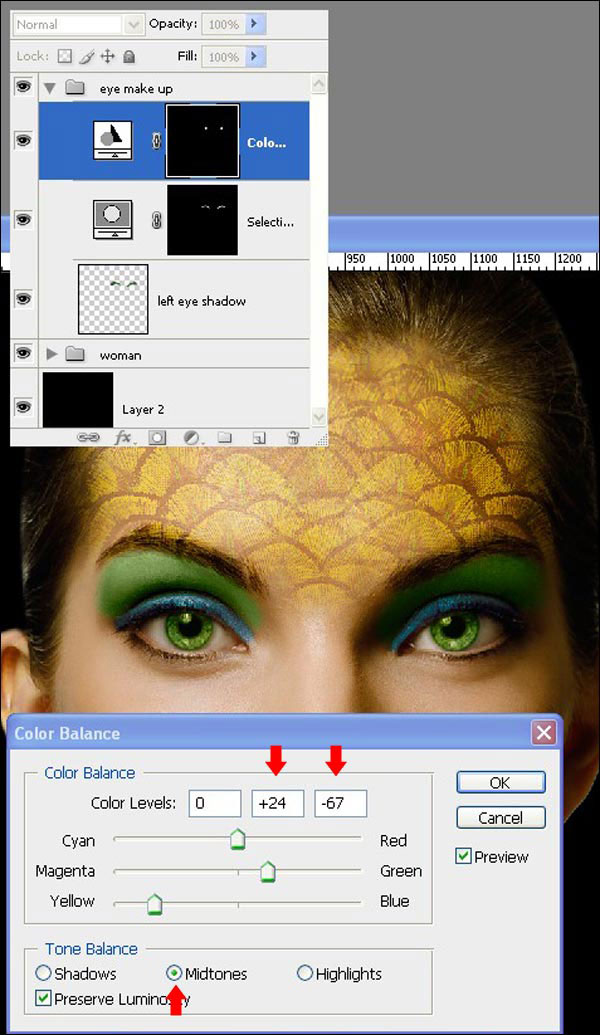 (Перо), чтобы выделить обе радужки глаз. Примените Feather (Растушевка) 1px, а затем примените корректирующий слой Color Balance (Цветовой баланс) с настройками, как на скриншоте ниже.