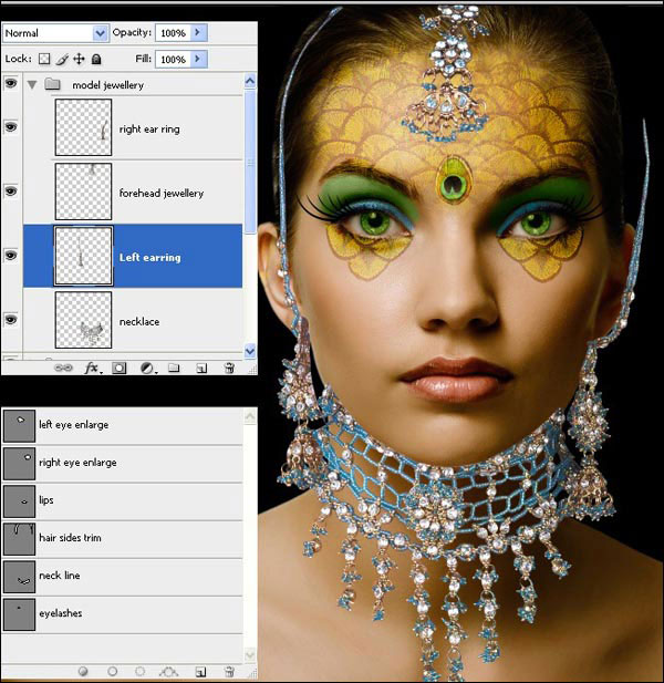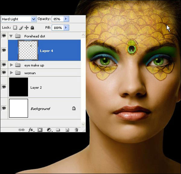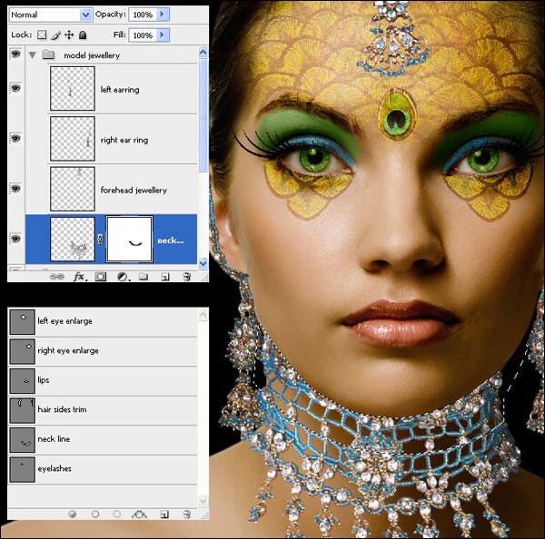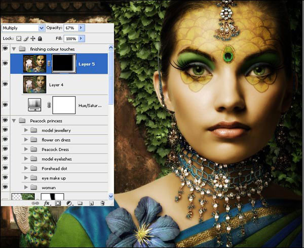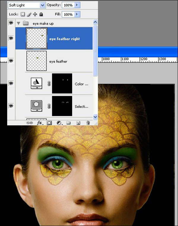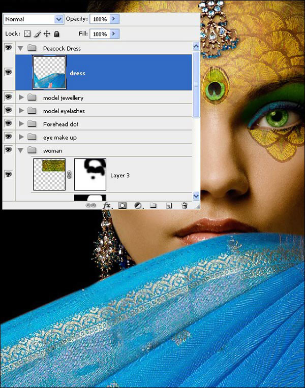 Теперь мы добавим макияж глаз модели. Удерживая клавишу Shift, выделите слои от «Перья павлина» до «Модель», и нажмите Ctrl+G, чтобы поместить их в группу, переименуйте группу в «Девушка».