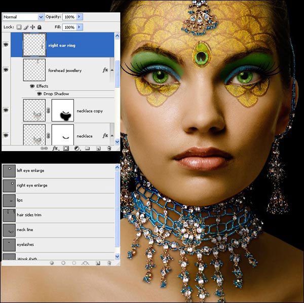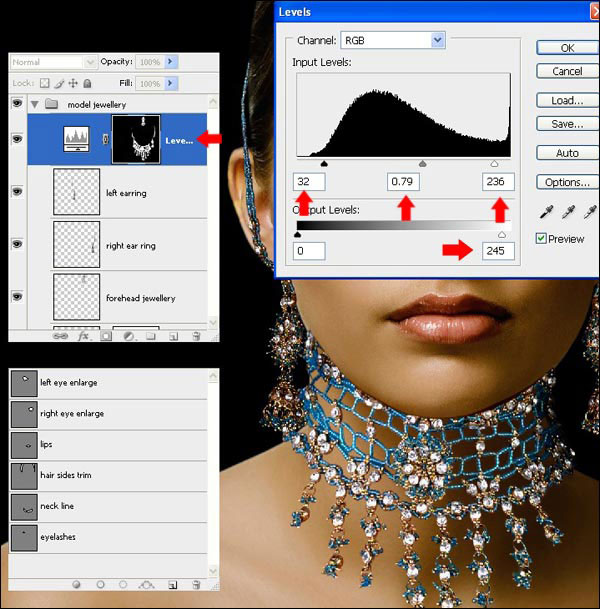 (O) (Затемнитель) и укажите следующие настройки Range (Диапазон): Highlights (Света), Exposure (Експозиция) 32% и размер кисти 65px. Теперь скройте яркие блики на правой стороне ожерелья для затемнения этой области. Теперь выберите слой «Серьга справа» и скройте несколько ярких бликов на нем.