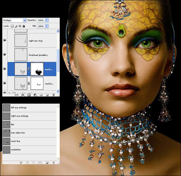 Теперь нам нужно затемнить драгоценности, чтобы они соответствовали освещению на модели. Перейдите в группу «Ювелирные украшения» и выберите слой «Ожерелье». Выберите Burn Tool