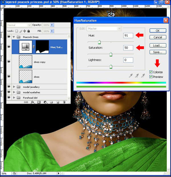(Перо) выделите серебряную полоску тесьмы на платье, как показано красным цветом на скриншоте. Создайте выделение контура и примените Feather (Растушевка) 1px. Затем создайте новый корректирующий слой Hue /Saturation (Цветовой тон/Насыщенность) с настройками, показанными ниже.